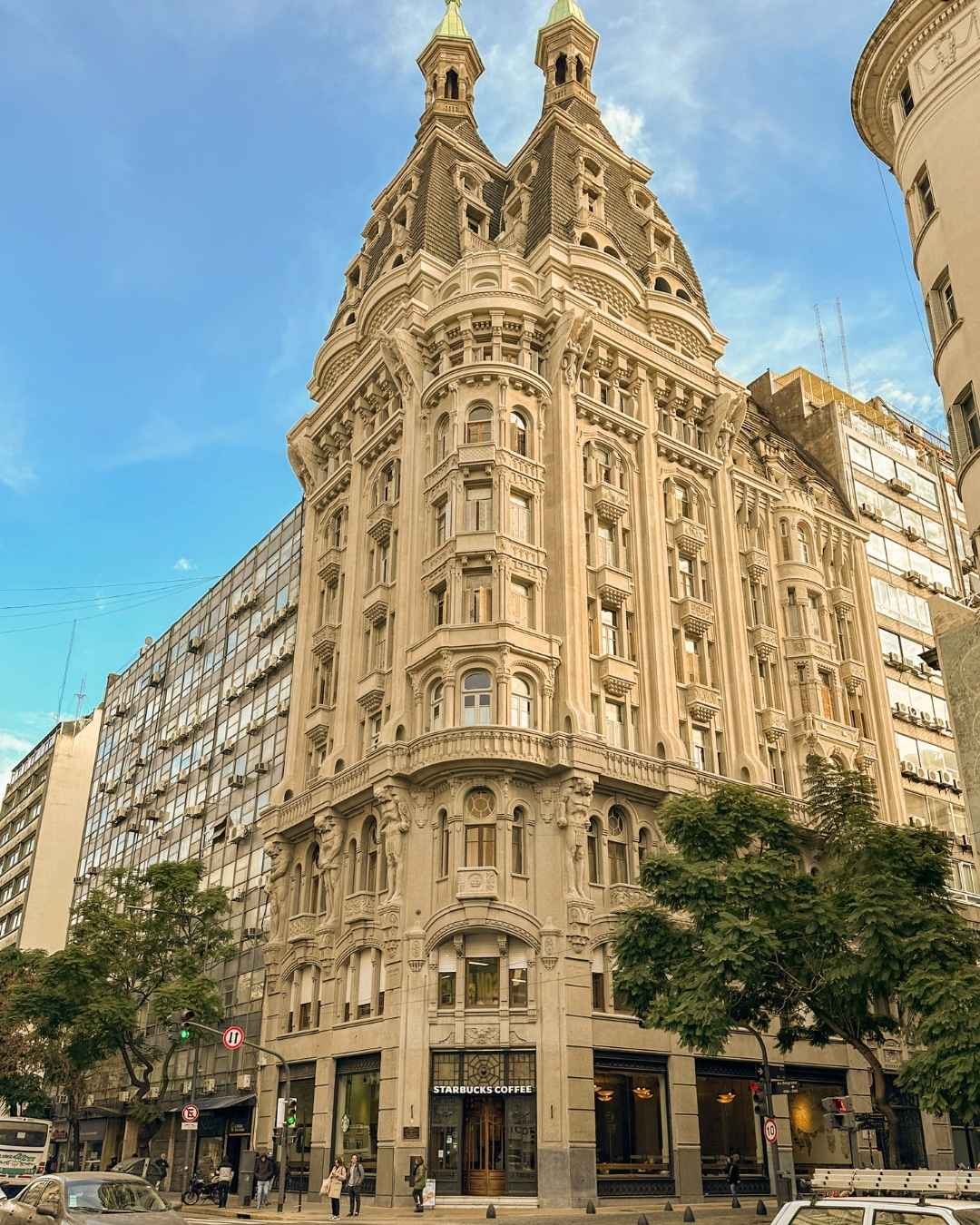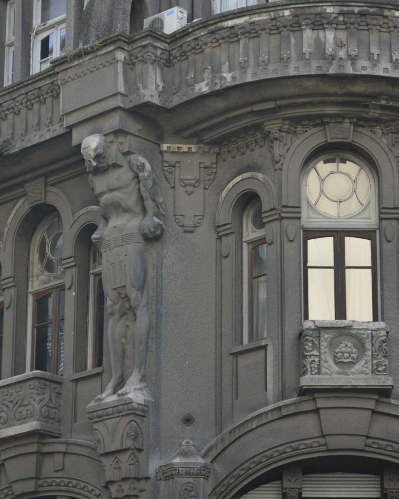 Los ocho atlantes —figuras forzadas que representan distintos gremios— son uno de los elementos más significativos del edificio.